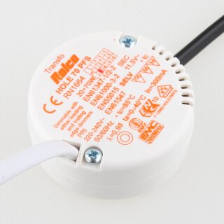Kompakter elektronischer Sicherheitstrafo 20–70W von Relco für Halogenlampen. Dimmbar, sicher und platzsparend – ideal für den Leuchtenbau.