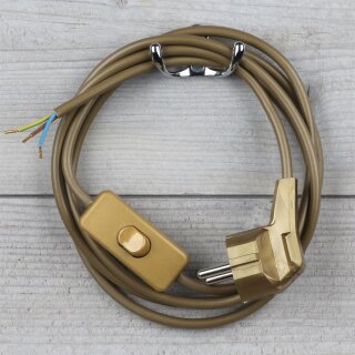 Die PVC-Anschlussleitung gold 3-adrig mit Schnurschalter und Schutzkontakt-Stecker ist eine anschlussfertige, hochwertige Zuleitung für Leuchten mit Schutzleiteranschluss.