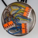 Die Verkabelung der fünf Pendelleuchten erfolgt bequem im Inneren des Baldachins – am besten mit 5-poligen Lüsterklemmen oder WAGO-Verbindungsklemmen.